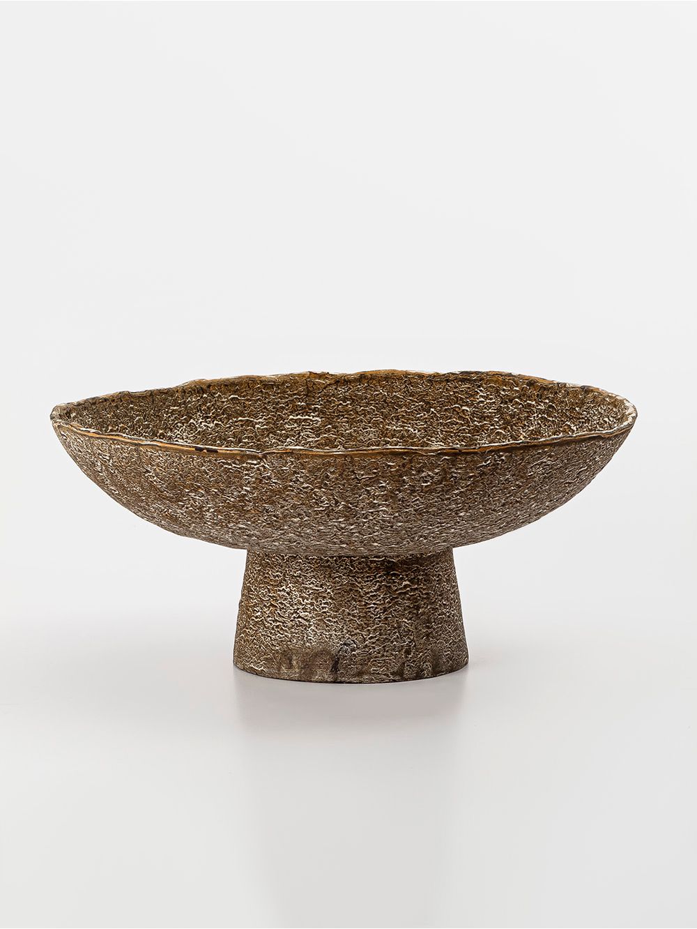 Este centro de mesa presenta un diseño escultórico y distintivo, elaborado en un acabado marrón con textura rugosa que realza su aspecto artesanal. Su forma amplia y redondeada, sostenida sobre una base sólida y ligeramente cónica, lo convierte en una pieza versátil y elegante. Ideal para vestir la mesa principal, aparadores o consolas, aporta un aire sofisticado y natural al ambiente. Su estilo combina a la perfección con decoraciones contemporáneas, rústicas o minimalistas, destacando tanto vacío como acompañado de elementos decorativos.