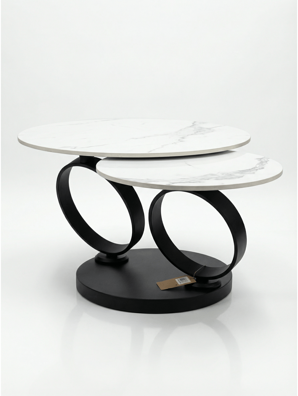 La Mesa Baja Cetara Mobile White es una pieza escultórica que aporta luminosidad y dinamismo al salón contemporáneo. Su diseño único consta de dos superficies circulares superpuestas con un exquisito acabado en mármol blanco y vetas grises sutiles. La estructura se apoya sobre dos icónicos soportes en forma de anillo negro que crean un contraste visual impactante y moderno. Esta mesa no solo destaca por su belleza estética, sino también por su funcionalidad móvil, siendo el centro de atención ideal para ambientes que buscan un estilo premium, ligero y sofisticado