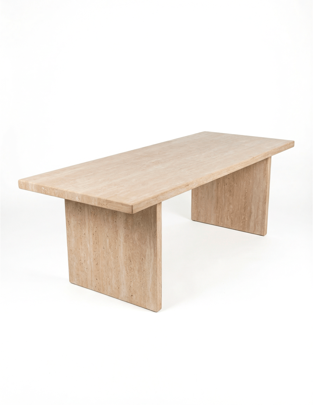 Esta mesa de comedor LACTON es una imponente pieza de diseño que se inspira en la estética minimalista y brutalista. La totalidad de la mesa, tanto la tapa rectangular como las dos patas de soporte anchas y planas, presenta un acabado en color travertino, caracterizado por su tono beige claro, su textura porosa y sus vetas naturales, que le confieren un aire de nobleza y atemporalidad. La forma es puramente geométrica: la tapa parece flotar sobre los dos bloques macizos de las patas. Este diseño monolítico y escultural es ideal para crear un punto focal sofisticado y elegante en comedores contemporáneos que buscan materiales naturales y líneas limpias