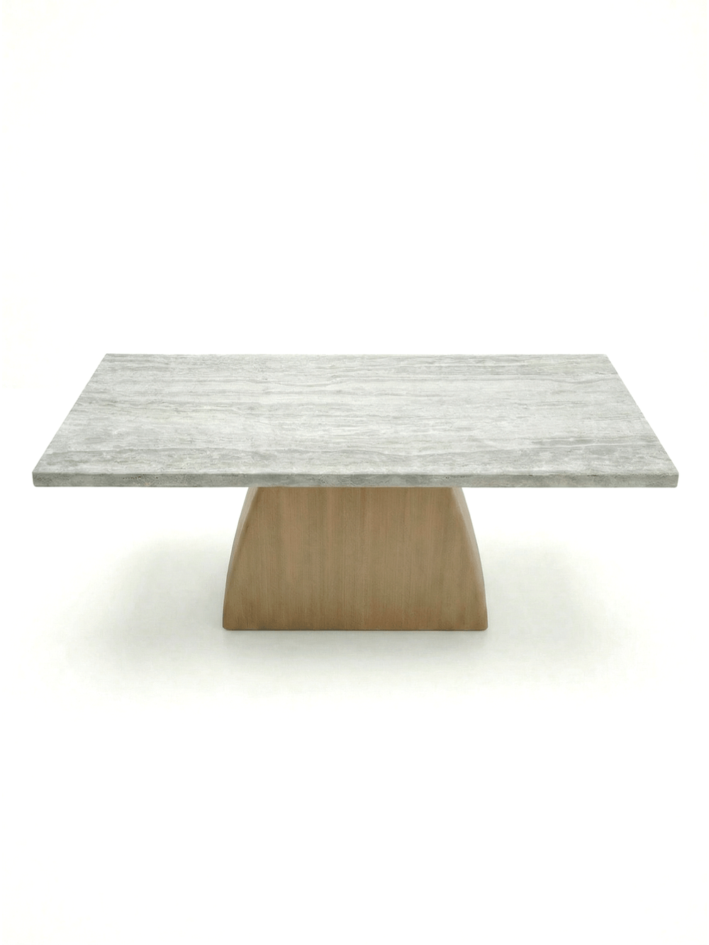 Esta mesa de comedor PRINTH combina una silueta escultórica con una paleta de colores neutra y sofisticada. Su elemento distintivo es la base central maciza de madera en tono Pinor, con una forma de arco suavemente curvado, que le confiere solidez y un toque orgánico. La tapa rectangular es plana y delgada, presentada en un acabado de color gris claro con vetas sutiles, una piedra natural como el mármol. Este contraste entre la calidez de la base de madera y la frialdad elegante de la tapa de piedra gris resulta en una pieza de diseño contemporáneo y minimalista, perfecta para comedores que buscan sofisticación sin sobrecargar el espacio
