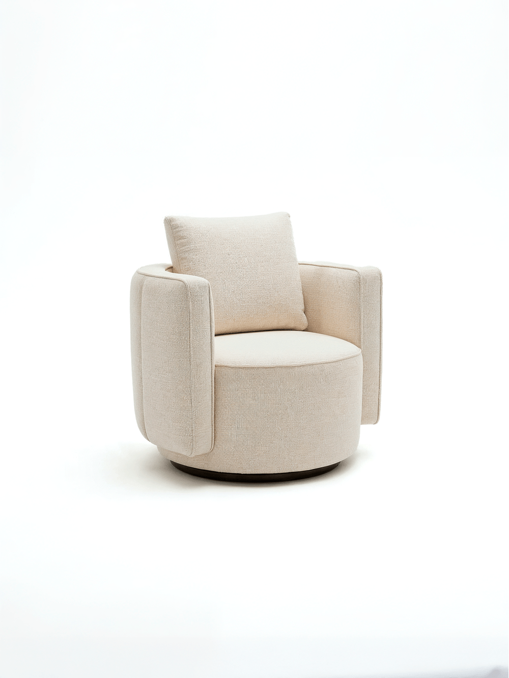 El Sillón Giratorio Tropez irradia una elegancia minimalista y contemporánea. Su diseño se caracteriza por una forma cilíndrica y compacta, que crea una silueta suave y acogedora. Está tapizado en una tela texturizada color beige o crudo, que aporta calidez y un tacto agradable. Los apoyabrazos y el respaldo presentan un sutil detalle de costura vertical, añadiendo un toque de sofisticación. La base giratoria integrada no solo le otorga funcionalidad, sino que también realza su estilo moderno. Ideal como pieza auxiliar en salas de estar o dormitorios que buscan un asiento cómodo, versátil y de estética nórdica o japandi.