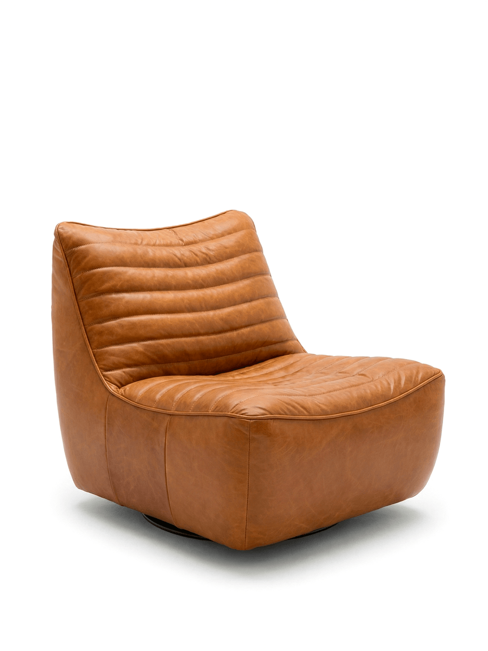 Sillón lounge de perfil bajo y diseño ergonómico, perfecto para relajación. Su forma envolvente presenta un asiento profundo y reclinado. Está tapizado en cuero genuino de color marrón. El diseño se distingue por el acolchado horizontal en el asiento y el respaldo, que aporta textura y un aspecto vintage moderno. Acentuando su estética compacta y de volumen
