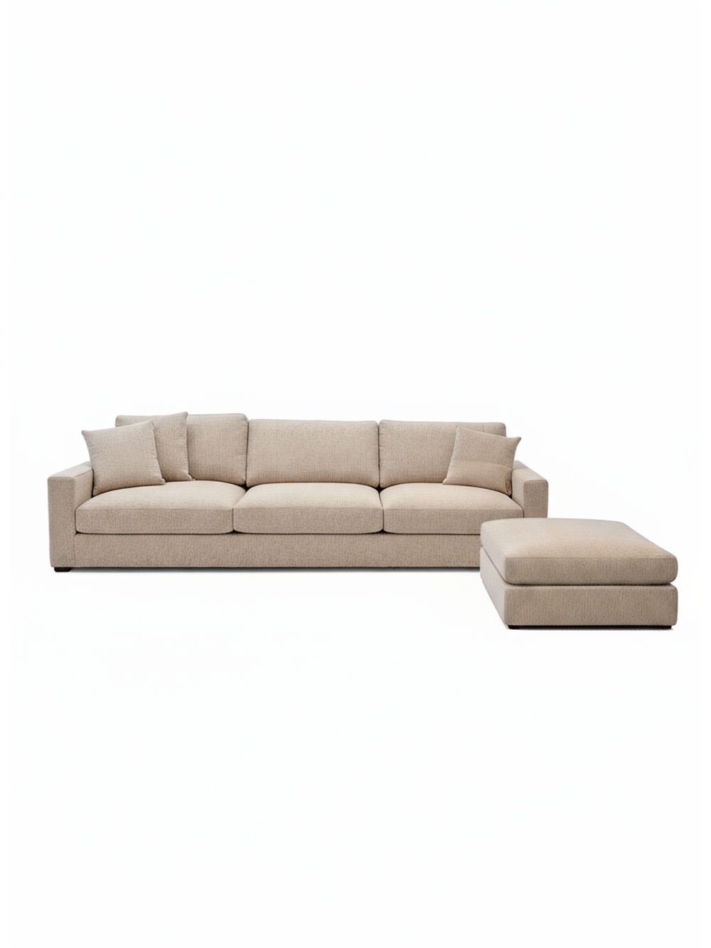Nuestro Sofá Belmont Prado Beige, es la personificación de la comodidad y el estilo atemporal. Con un diseño contemporáneo, este sofá invita al relax y se adapta armoniosamente a cualquier sala de estar moderna. Su tapizado en tela de textura sutil ofrece una sensación cálida y acogedora, mientras que los asientos y respaldos mullidos garantizan un confort excepcional. El puff a juego añade una versatilidad funcional, permitiendo extender el área de descanso o utilizarlo como asiento auxiliar. Es la elección perfecta para quienes buscan durabilidad, estética refinada y gran capacidad.