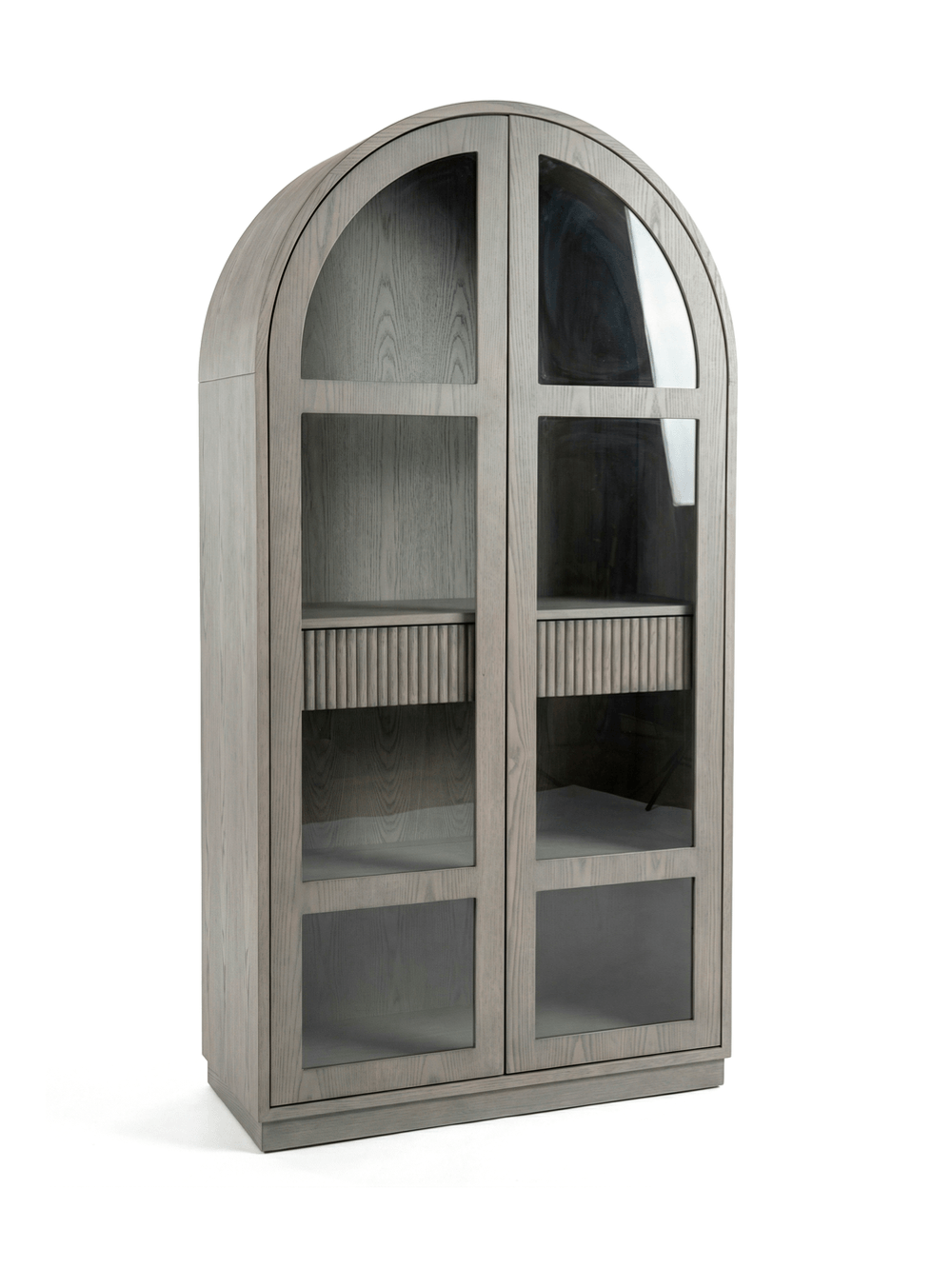 Esta vitrina GAEL destaca por su silueta arquitectónica con la parte superior en forma de arco, inspirada en las tendencias de diseño Art Decó y contemporáneo. Está fabricada en madera con acabado tono Pinor (grisáceo claro, mostrando la veta), lo que le otorga una estética elegante y moderna. Sus dos puertas incorporan amplios paneles de cristal que permiten exhibir el contenido. En su interior, presenta estantes y un discreto cajón o espacio de almacenamiento bajo con un detalle de relieve acanalado, que rompe la monotonía. Es un mueble sofisticado, ideal para almacenar y exponer vajilla, libros o piezas decorativas en comedores, salas de estar o estudios, añadiendo un toque de distinción y calidez